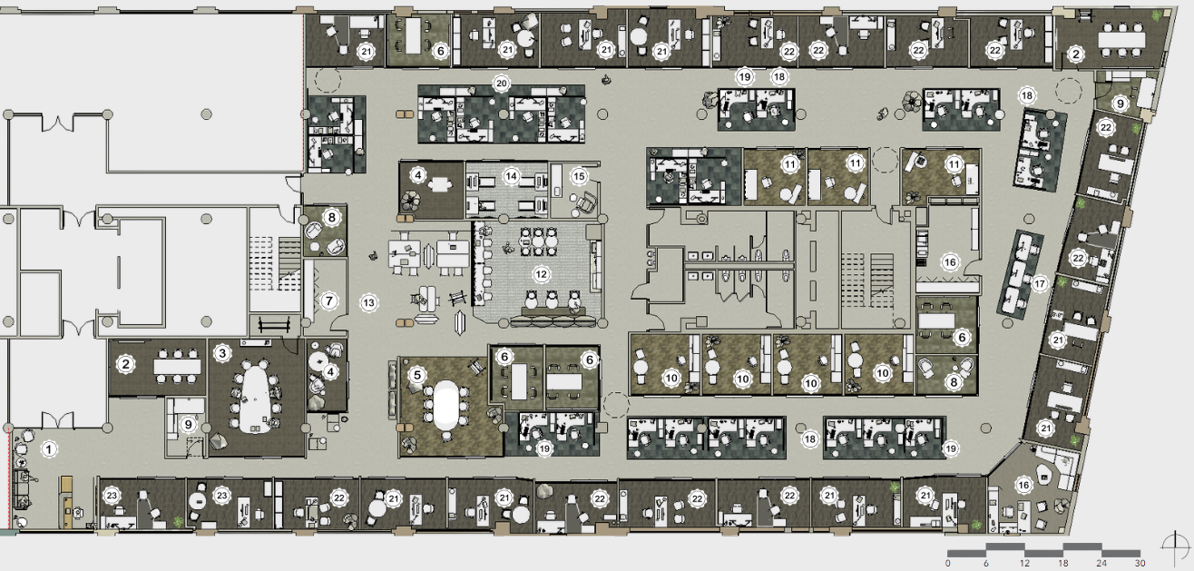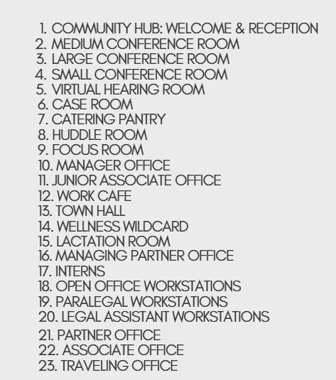 The design incorporates open office workstations for legal assistants, paralegals, office staff, and interns. Each workstation is equipped with inclusive furniture options, including height adjustable desks, privacy screens, and ergonomic seating. As modern workstyles continue to shift toward hybrid models, these open stations are designed to encourage quick mentorship, collaboration, and everyday connection within the office.