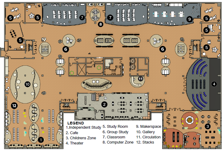 As the library shifts toward providing fewer physical materials, the design supports a variety of spaces built to nurture collaboration and learning. The floor plan prioritizes flexibility, allowing users to move seamlessly between focused study, group work, and shared learning environments.