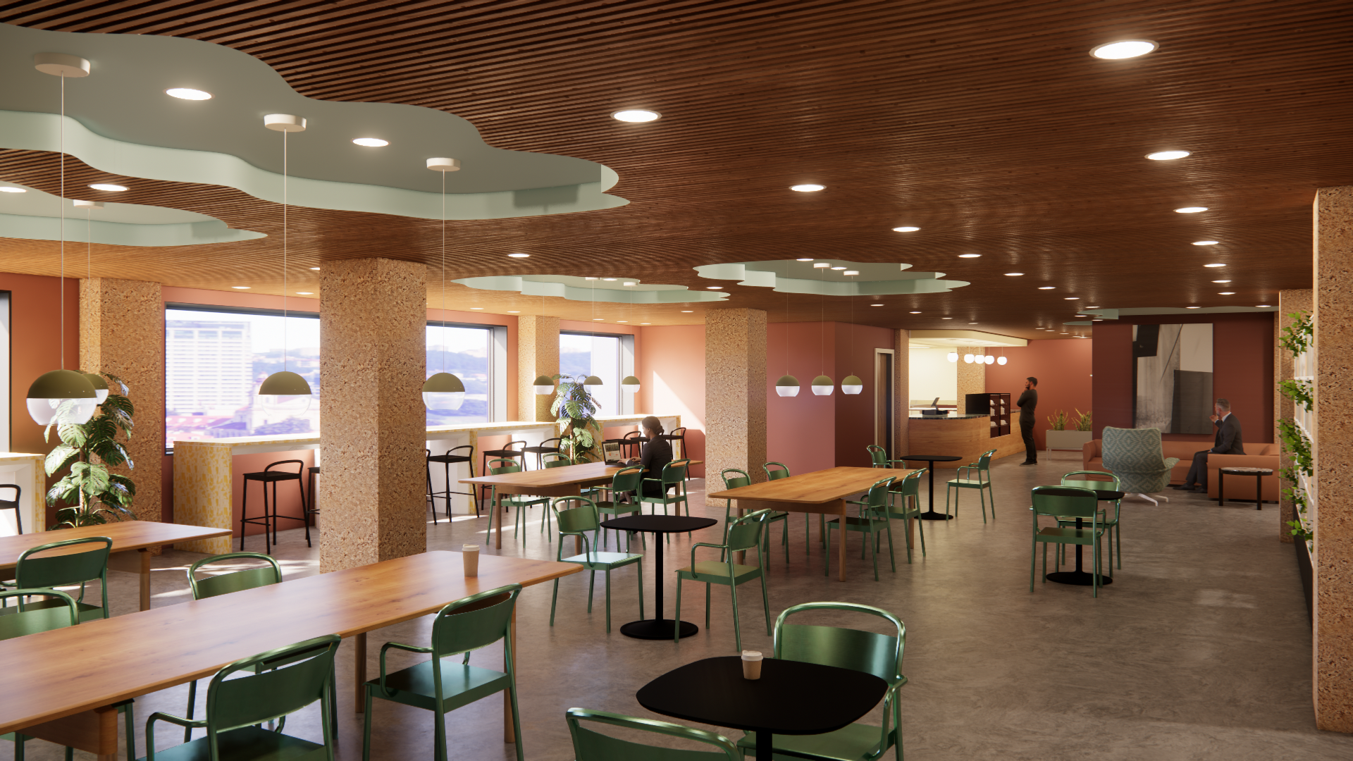 The ceiling design was inspired by streams naturally guiding travelers through nature, serving as a wayfinding element throughout the library. By playing with texture through the use of acoustic wood slats and layered ceiling forms, the design supports intuitive circulation while enhancing visual interest and acoustic performance