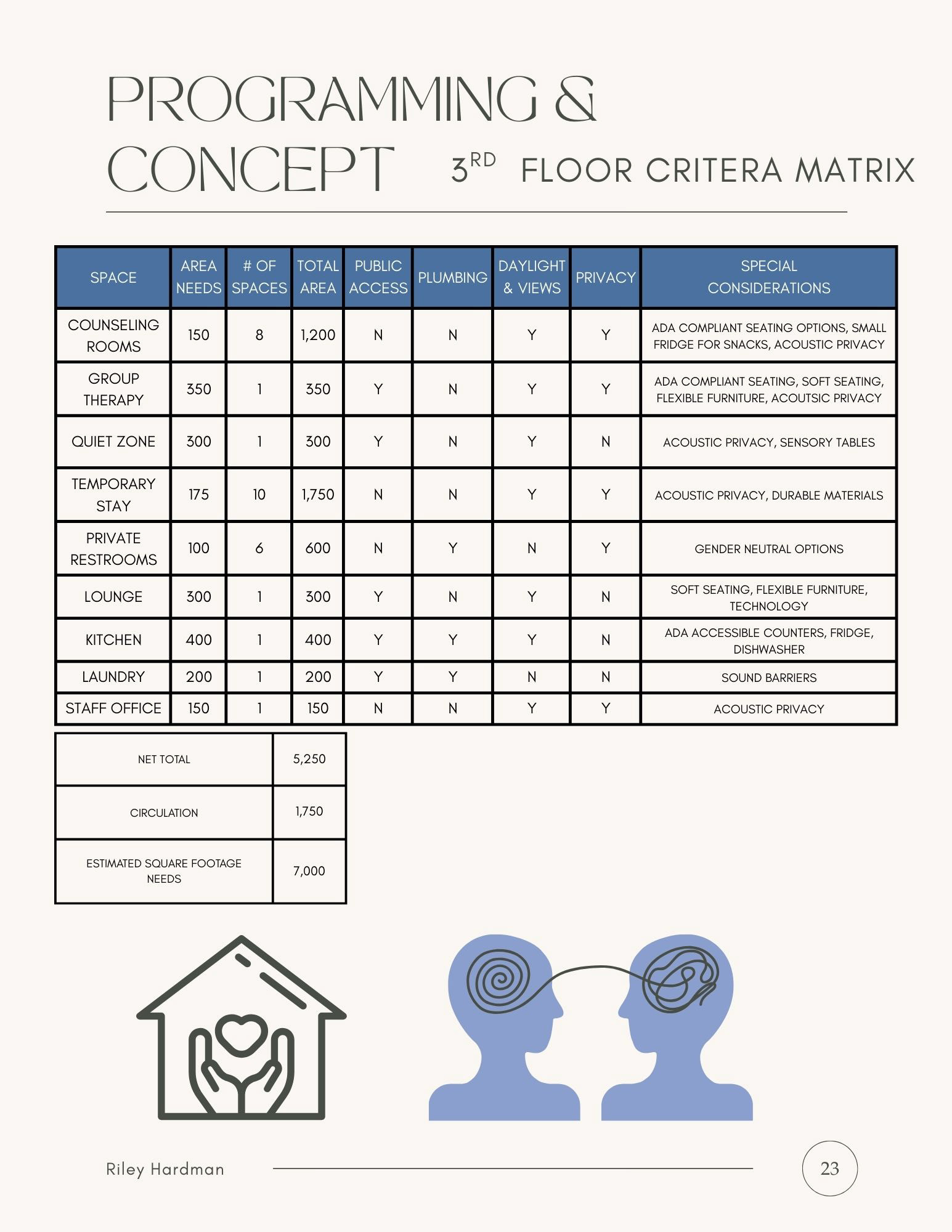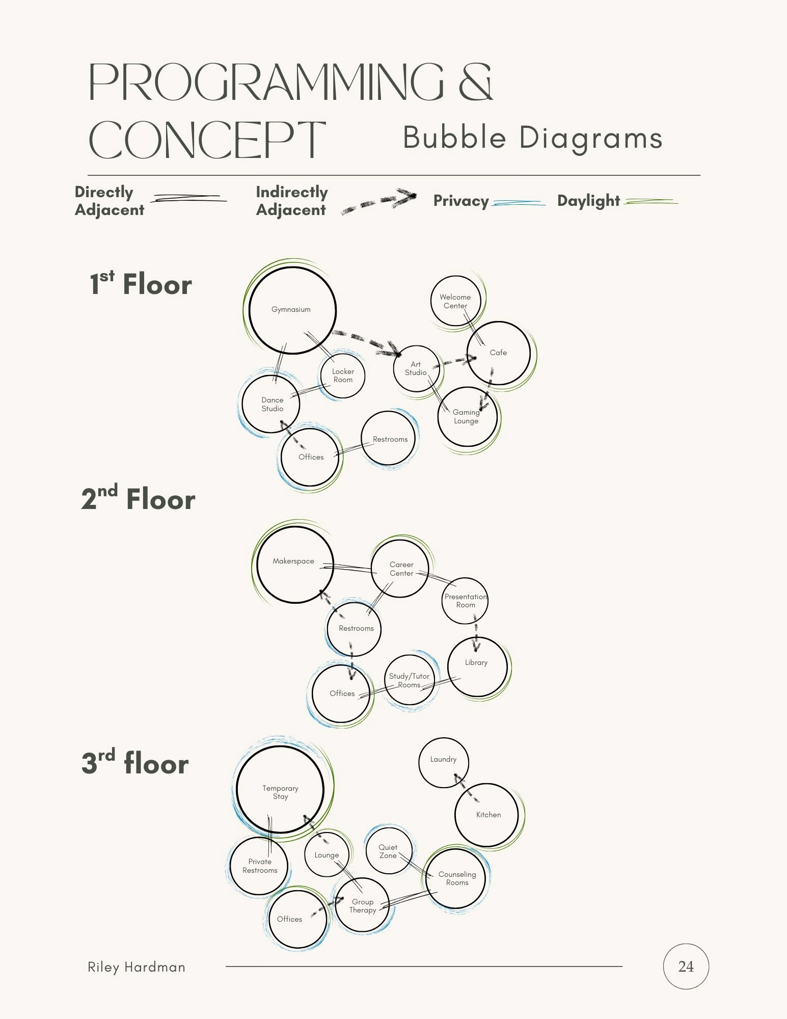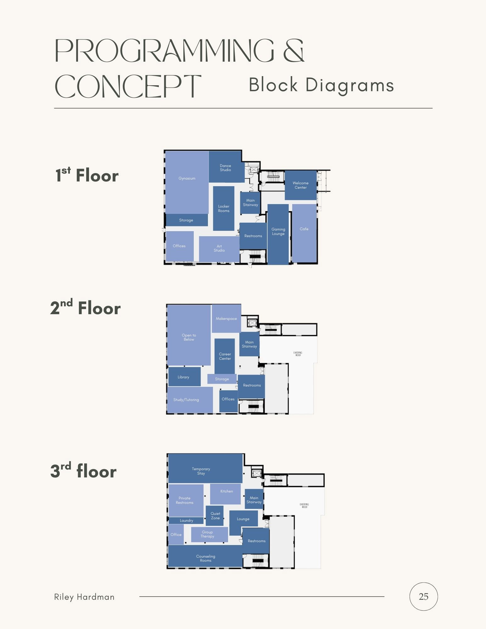 This design will foster a community centered built environment that supports developmental, educational, and emotional wellbeing in children and teens. Through playful color palettes that inspire creativity, customizable furniture layouts that promote inclusion, as well as soft material selections that enhance comfort and security. Each floor will focus on a different aspect of development for children’s evolving needs. Together these elements will form a welcoming and adaptable environment where every child and teen can feel supported, included, and empowered to grow.